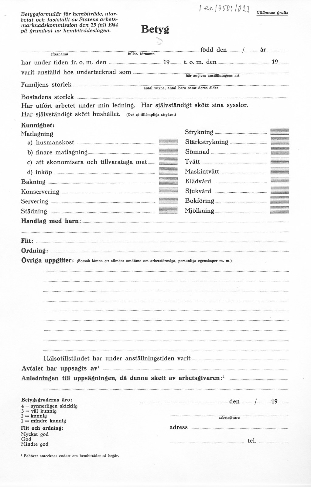 Betygsmallen från Statens arbetsmarknadskommission, som vi visar här ovan, är utformad 1944 ”på grundval av hembiträdeslagen”. Betygsgraderna var 1-4. För flit och ordning gällde Mycket god, God eller Mindre god. Arbetsgivare är fortfarande skyldiga att skriva intyg eller betyg om en anställd begär det. Lär dig koderna så att du slipper bli lurad – och får en chans att bemöta påståendena.