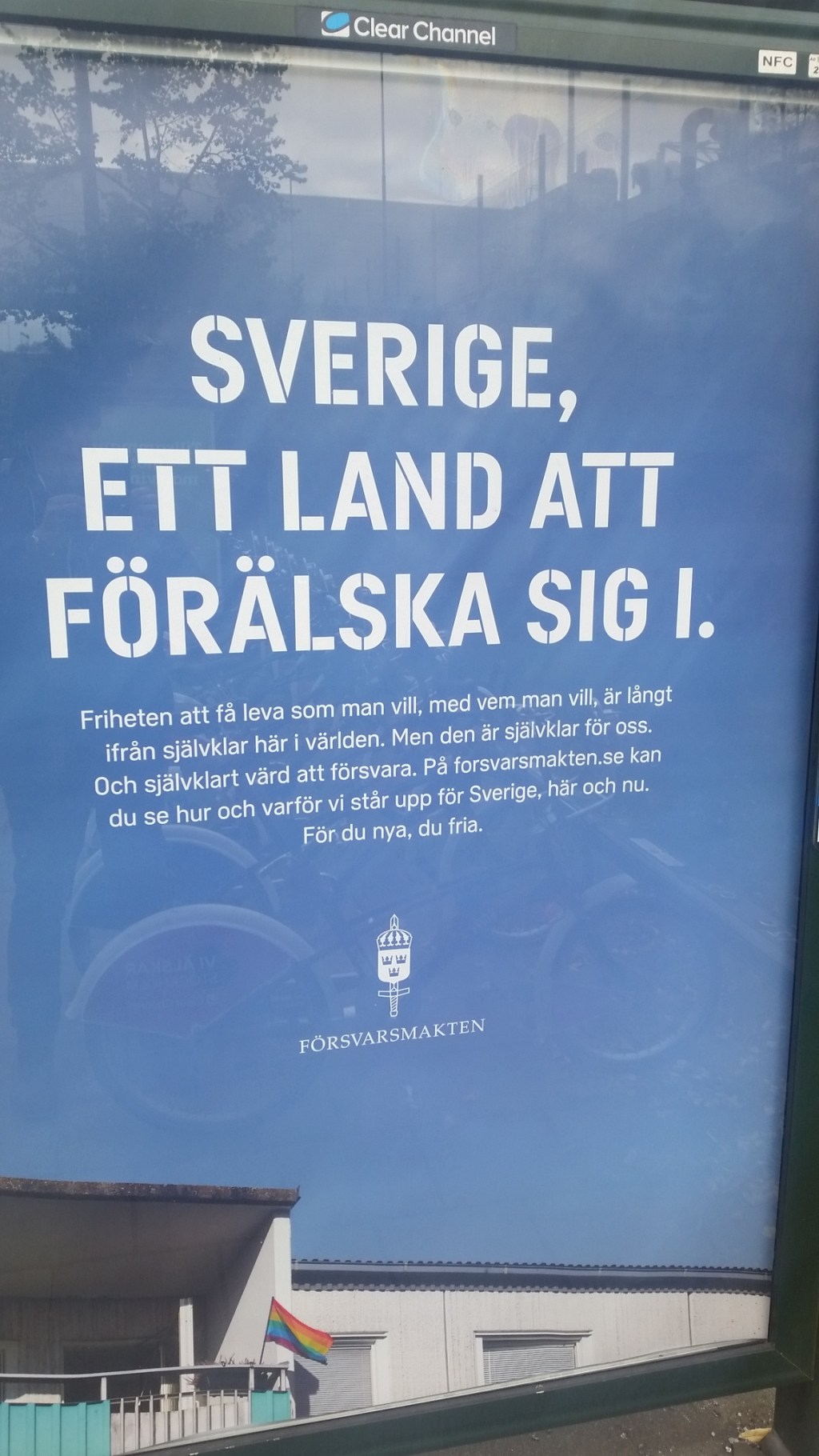 Försvarsmakten bedriver nu en reklamkampanj, där man förklarar varför Sverige är värt att försvara. Den bedrivs åtminstone i Stockholm, men jag antar att den pågår runt hela landet eftersom inte bara Stockholm är värt att försvara. Man möts av reklampelare med budskap som; ”Att få tänka som man vill, är otänkbart för många” och ”Sverige ett land att förälska sig i.” Undertecknare Försvarsmakten.